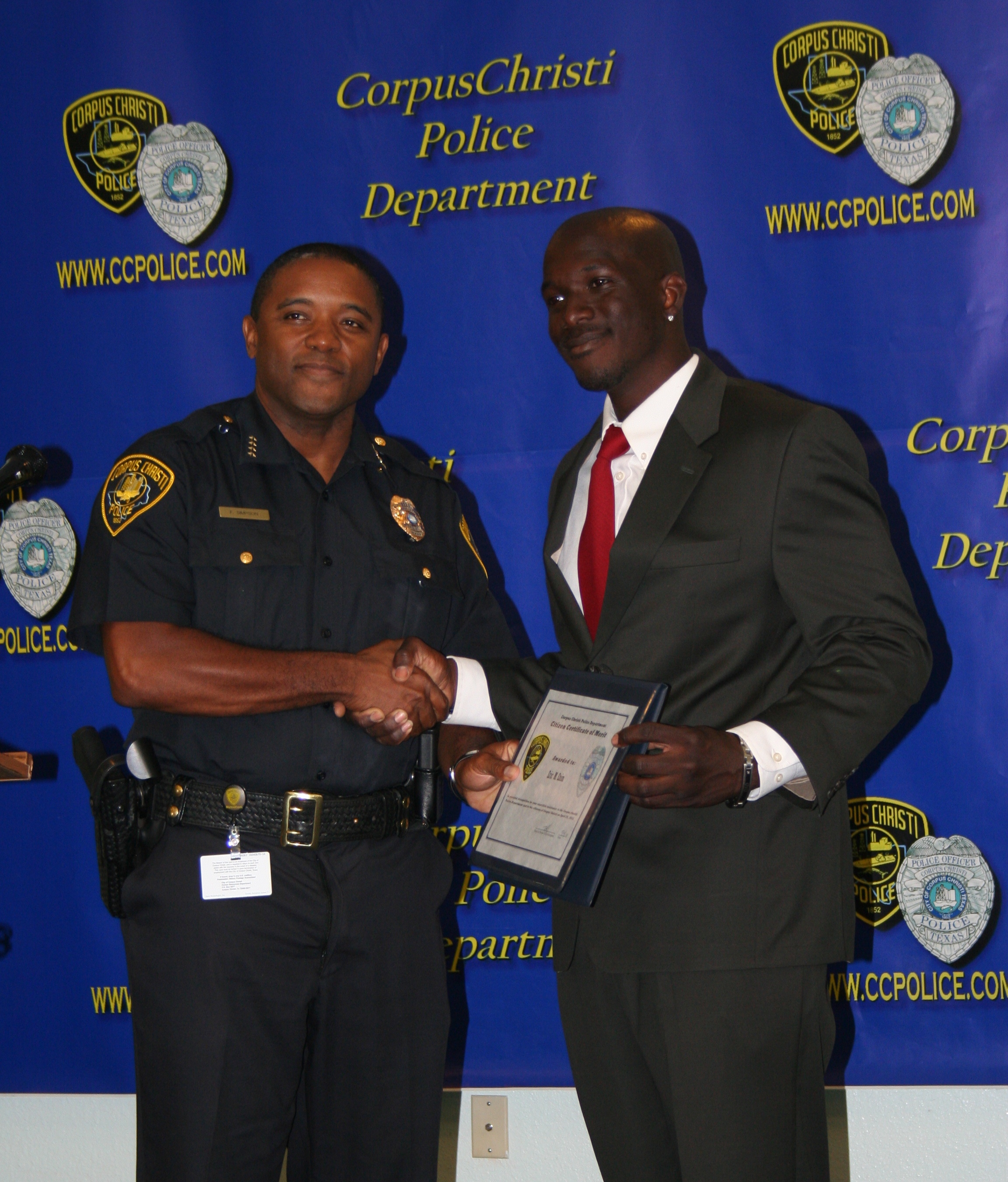 Chief Simpson presents Eric Enim with Citizen Certificate of Merit May 4, 2012 2304 × 2700 Police Department Honors Local Citizens Chief Simpson presents Eric Enim with Citizen Certificate of Merit