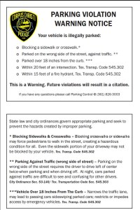 The Corpus Christi Police Department is announcing the beginning of the enhanced parking enforcement initiative. The goal of the initiative is to address often overlooked “quality of life” issues such as public sidewalks being blocked by vehicles, and other parking violations throughout the city. The initial phase of the initiative will focus on public education about parking laws and the importance of ensuring that roadways and sidewalks are open and accessible to vehicles, pedestrians, and emergency equipment. Officers will immediately begin issuing warning cards to vehicles parked in an improper manner.