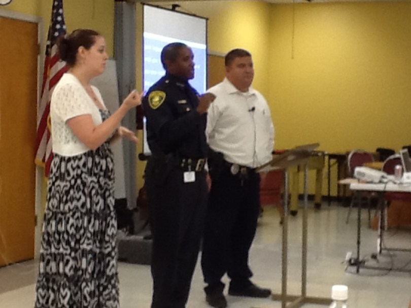 6-26-12 June 27, 2012 960 × 720 Chief Simpson Meets With Members Of The Deaf and Hard of Hearing Community Chief Simpson and Detective Alvarado field questions from the group through the use of an interpreter.