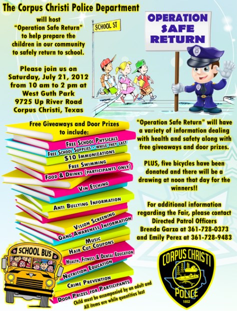 The Corpus Christi Police Department and Parks and Recreation Department would like the parents and children in the areas of West Oso, Tuloso-Midway, and Calallen School Districts to join us in the 1st Annual “Operation Safe Return.” This event will provide safety information, health information, and various services free of charge. Commander A. Frese has announced a second “Operation Safe Return” will be scheduled in August 2012 for Corpus Christi Independent School Department and Flour Bluff schools.