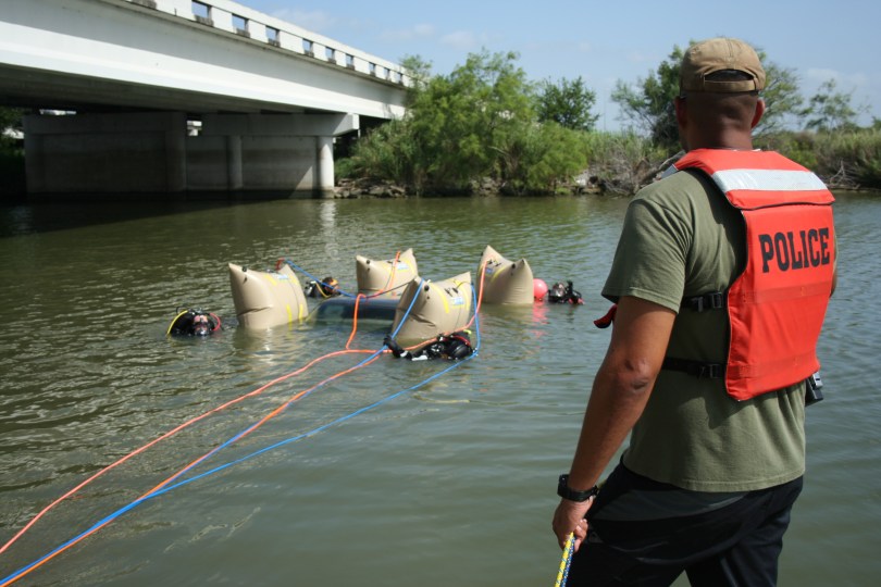 IMG_2099 July 24, 2012 3456 × 2304 Dive Team Trains With New Equipment Dive Team Member Eric Garza stands to watch for diver safety as divers manipulate a car raised in the Nueces River