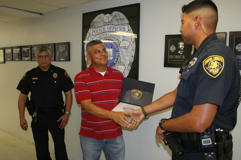 IMG_2343 August 10, 2012 3456 × 2304 Police Thank Citizen For Help Assistant Chief of Police J.V. Garcia stands with Victor Zamora as Officer Eric Garza thanks Mr. Zamora for his actions
