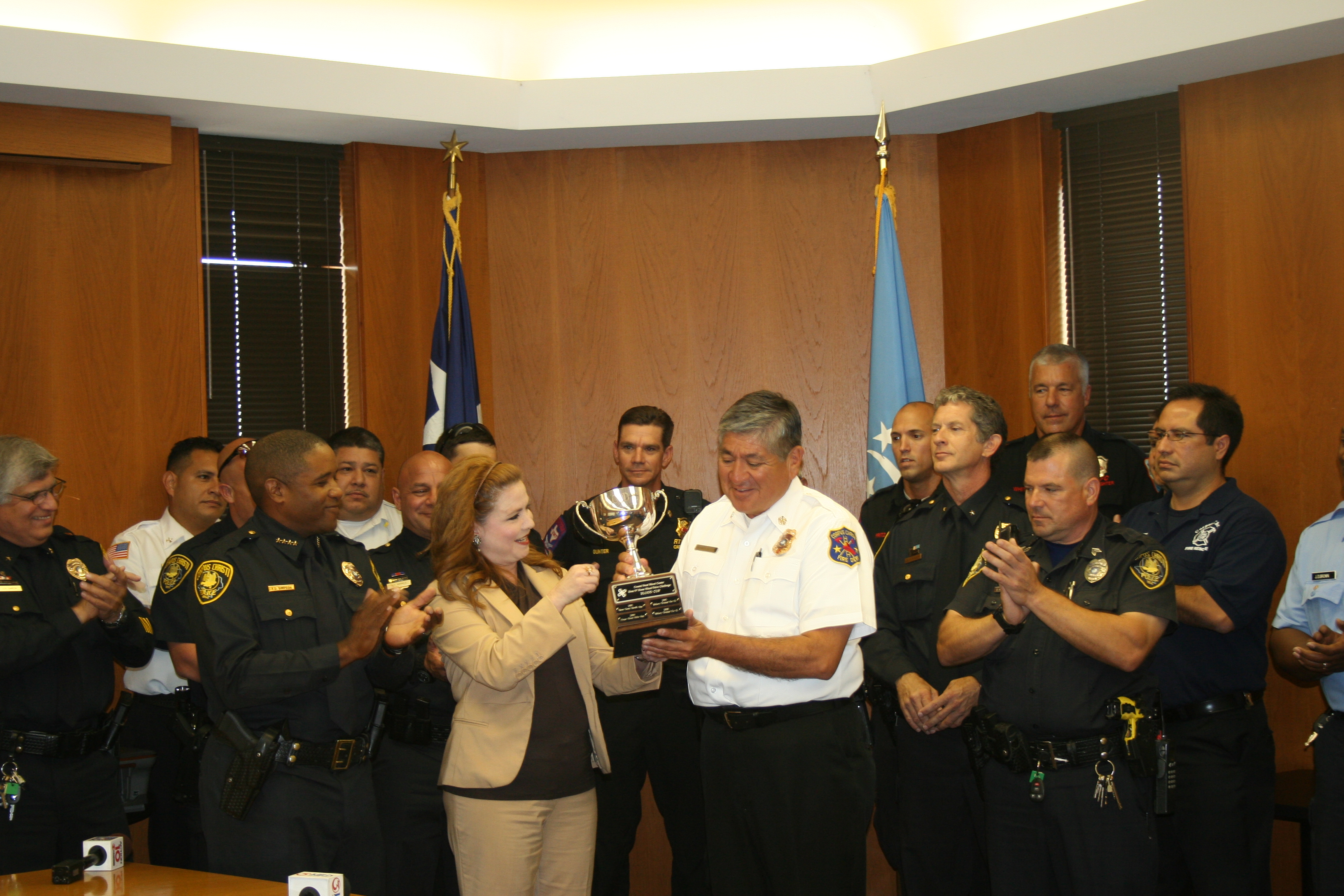 IMG_2413 August 27, 2012 3456 × 2304 Fire Department Wins Annual Guns & Hoses Blood Drive Corpus Christi Fire Chief Robert Rocha accepts the trophy for area Fire Departments for collecting the most units of blood in the Guns & Hoses blood drive
