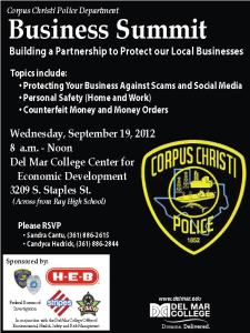 The Corpus Christi Police Department will host a business summit Wednesday, September 19, 2012 from 8:00am to noon at the Del Mar College Center for Economic Development located across from Ray high School at 3209 Staples Street.