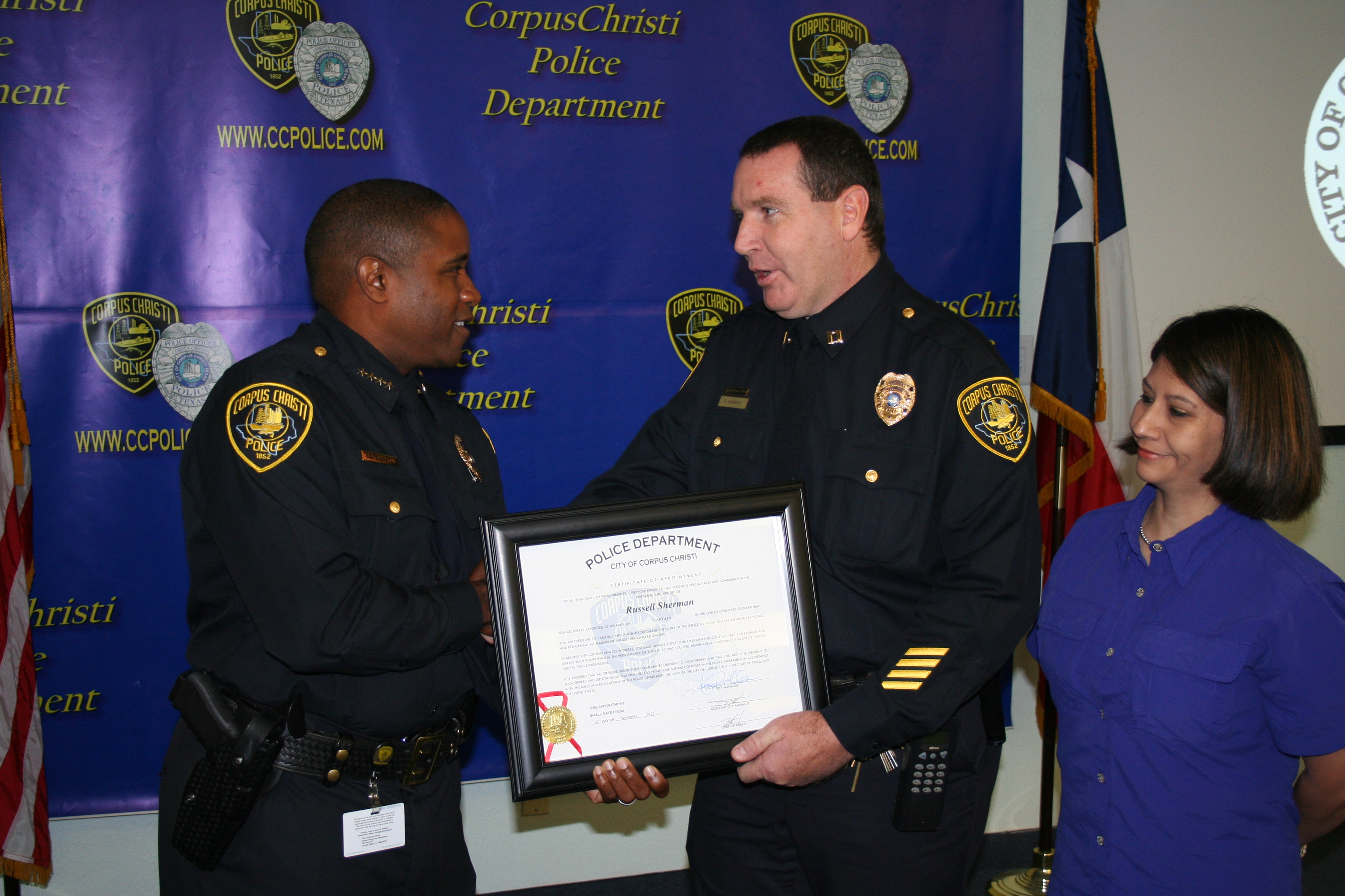 IMG_2635 September 21, 2012 3456 × 2304 Police Chief Promotes Sherman To Captain Police Chief Floyd Simpson hands a certificate of promotion to Russell Sherman and wife Claudia