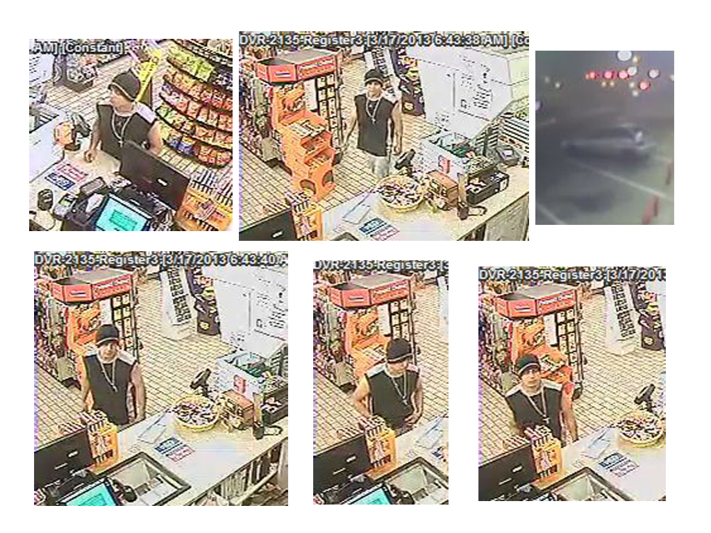 Corpus Christi Police are searching for a white man, about 18-25 years of age, about 160 pounds who wore a black ski cap with a light stripe, a black sleeveless athletic shirt with silver side stripes, a gold chain with a cross around his neck, and long cargo shorts. Police are also searching for the accomplice described as a white man who wore a red baseball cap with a flat brim, red sleeveless t-shirt, and long khaki shorts.