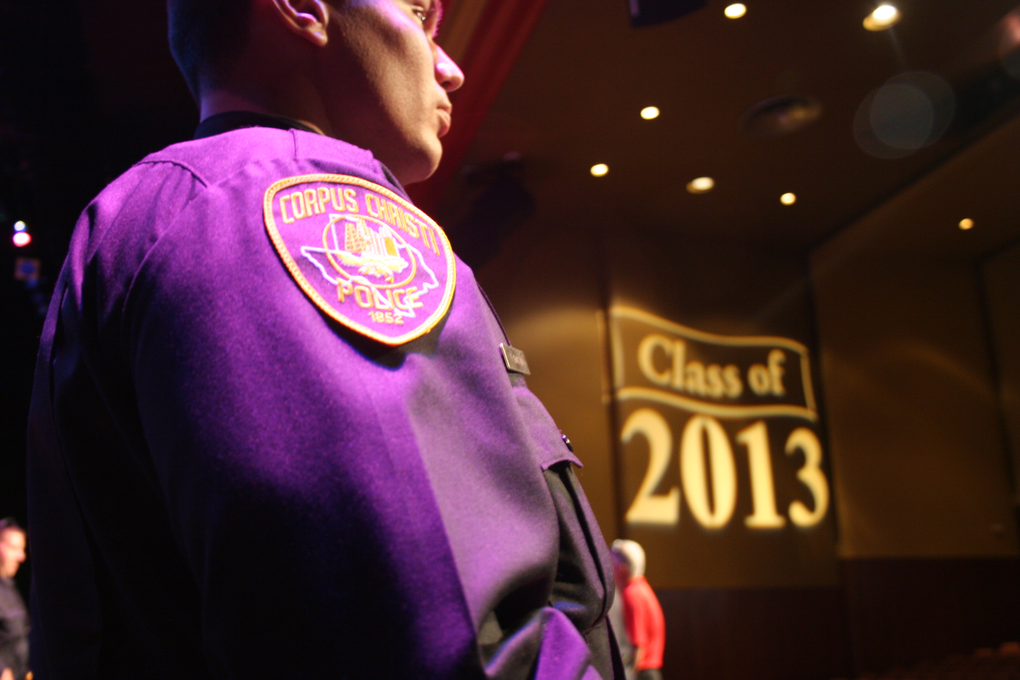 IMG_9017 August 9, 2013 3456 × 2304 71st Session of the Corpus Christi Police Academy Graduates Officer Taylor Ghastin stands proud to receive his badge