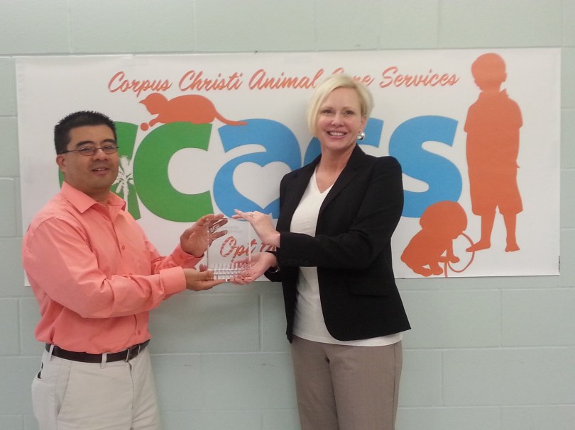 20140306_130946_15 March 7, 2014 3264 × 2448 Animal Care Services Announces Logo Contest Winner Animal Care Program Manager, Heather Hedrick (right) awards Miguel Quintanilla for wiinning the Animal Care Services Logo contest
