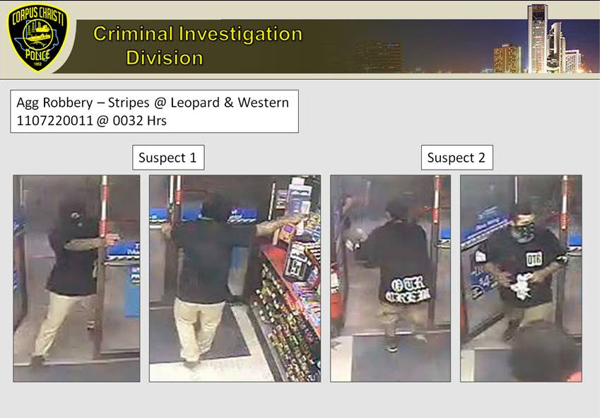 A 28 year old female clerk called police after two males entered the Stripes Store located at 11901 Leopard Street, one wearing a dark jacket, a ski mask and armed with a handgun, and demanding money. The other male jumped over the counter and removed money from the register and they both left the store on foot. The suspect armed with the weapon was described as a Hispanic male, unknown age, about 5’7” to 5’10”, 140 to 160 pounds, wearing a dark shirt and khaki pants. The suspect who jumped the counter and grabbed the money is described as a white male unknown age height or weight, last seen wearing a black shirt with white writing on it, khaki shorts and a bandana. Detectives investigating this case released camera images of both suspects involved in this robbery. Anyone who can identify the individuals responsible, or has any additional information about this crime should call the Corpus Christi Police Robbery / Homicide Detectives at 886-2840. Anyone who would like to keep their identity secret and still provide information to Detectives should call Crime Stoppers at 888-TIPS (8477) or submit the information online at http://www.888TIPS.com. Information provided to Crime Stoppers which results in an arrest may earn the caller a cash reward.