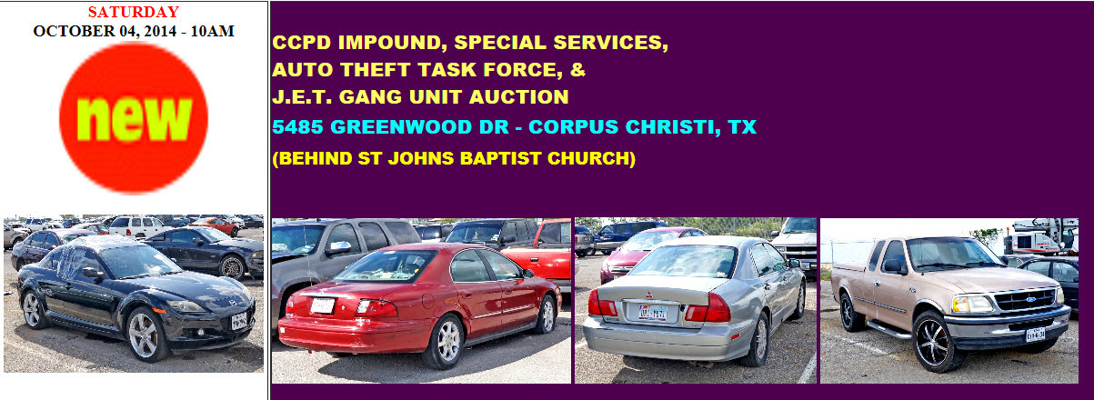 The City of Corpus Christi will auction over 88 cars, trucks, vans and motorcycles at the Corpus Christi Police Vehicle Impound Lot located at 5485 Greenwood Drive on Saturday, October 4, 2014 at 10:00 a.m. The general public is encouraged to register and view the vehicles for auction from 9:00 a.m. to 4:00 p.m. on Friday, October 3. The general public can also register and view the vehicles again from 8:00 a.m. to 10:00 a.m. on the day of the auction. The vehicles for auction may be viewed online and an auction list may be downloaded from http://www.siskauction.com.