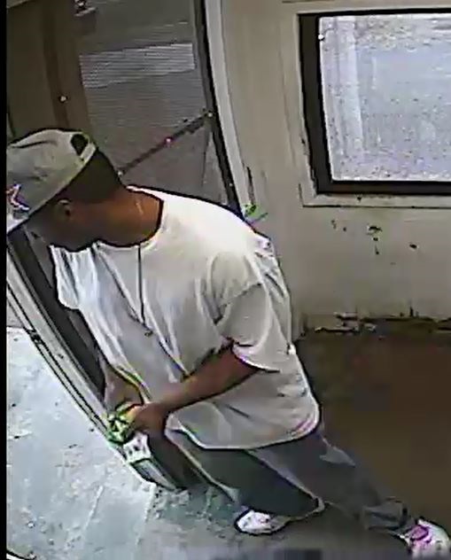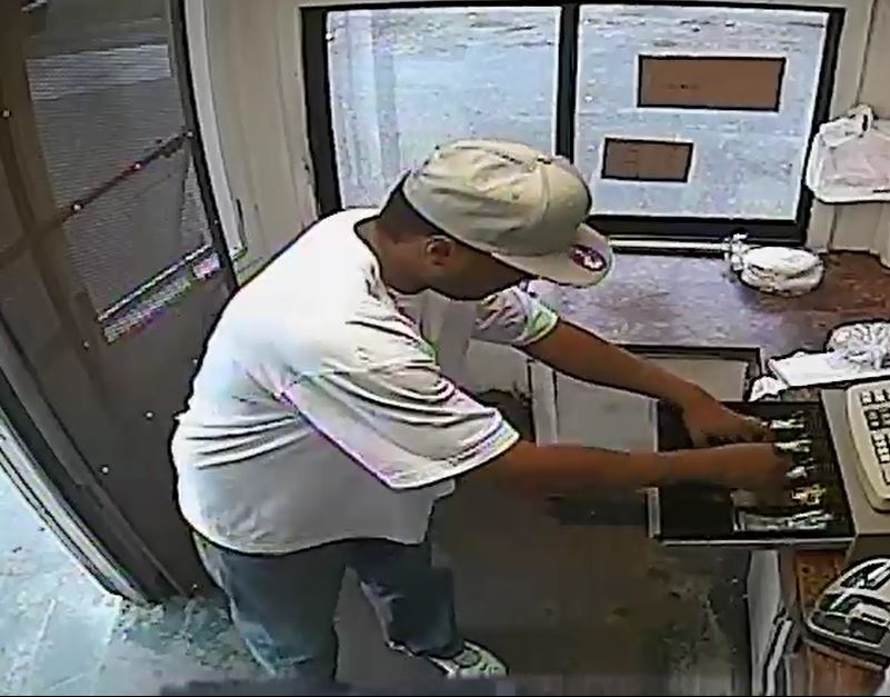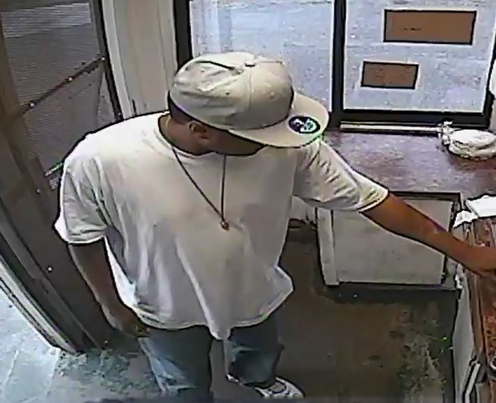 The suspect was last seen leaving the business, walking towards Robby Street. He is described as a dark skinned male in his late twenties to early thirties, about 6’0” tall, weighing 180 pounds. He was last seen wearing a white t-shirt, blue jeans, a grey cap and a long necklace around his neck.