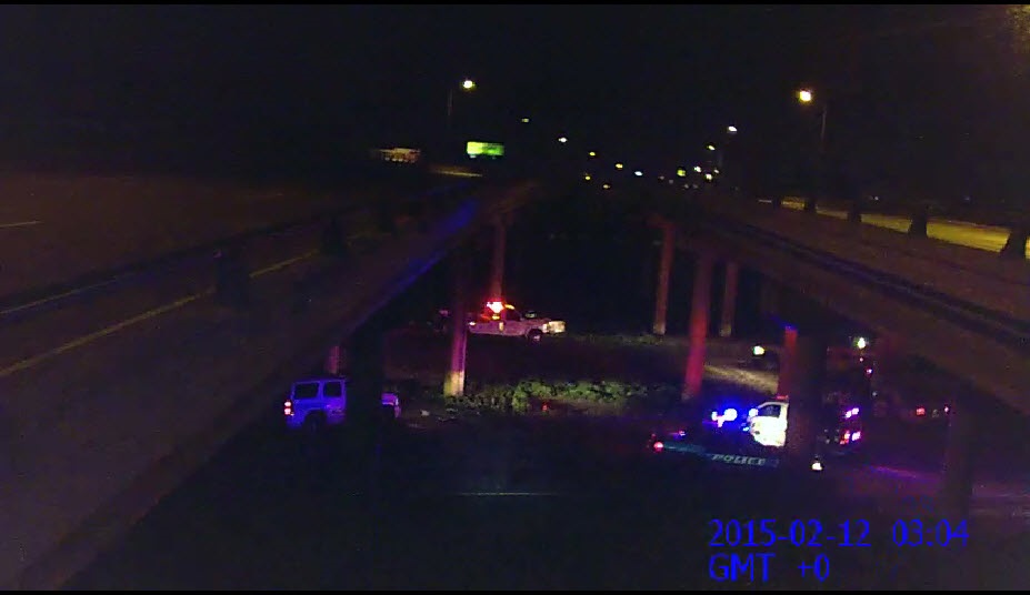 A view from an officer body camera at the location where the vehicle left the freeway. It traveled down the embankment between the north (right side of picture) and south lanes (left side of picture) of the Crosstown Freeway to the area below.