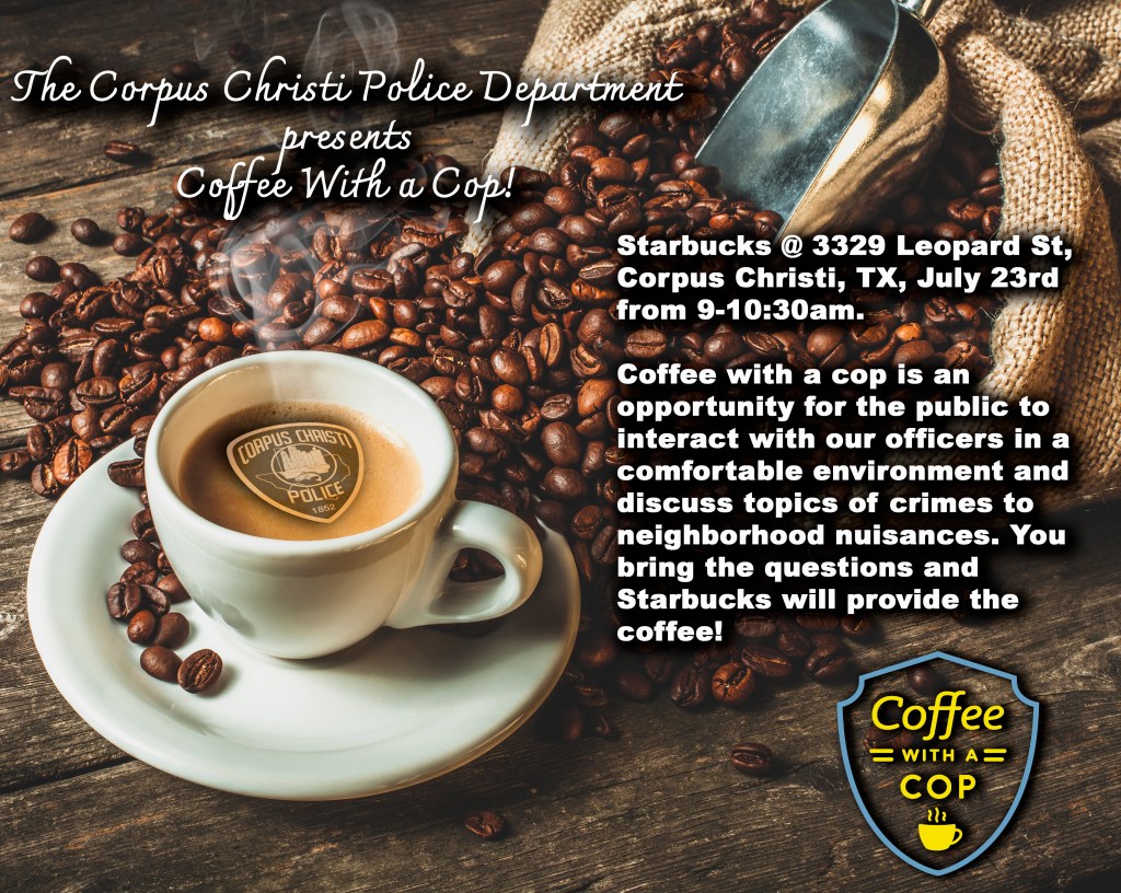 Join us for Coffee with a Cop on Tuesday, July 23, 2024, from 9:00-10:30am at the Starbucks at 3329 Leopard Street (Leopard/Nueces Bay).