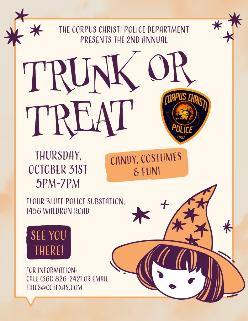 Please join the Corpus Christi Police Department for the 2nd Annual Trunk or Treat, this evening from 5pm-7pm at the Flour Bluff Police Substation (1456 Waldron Road). There will be candy, costumes and fun! See you there!
