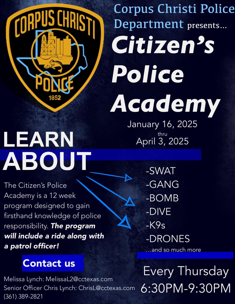 The Corpus Christi Police Department is currently accepting applications for the 54th Citizen’s Police Academy! The deadline to apply is December 15, 2024.