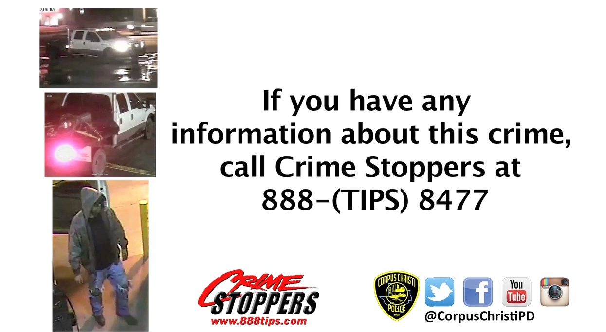 Anyone who has any additional information about this crime should call the Corpus Christi Police Property Crimes Detectives at 886-2841. Anyone who would like to keep their identity secret and still provide information to Detectives should call Crime Stoppers at 888-TIPS (8477) or submit the information online at http://www.888TIPS.com. Information provided to Crime Stoppers which results in an arrest may earn the caller a cash reward.