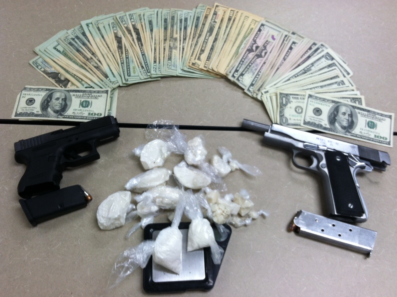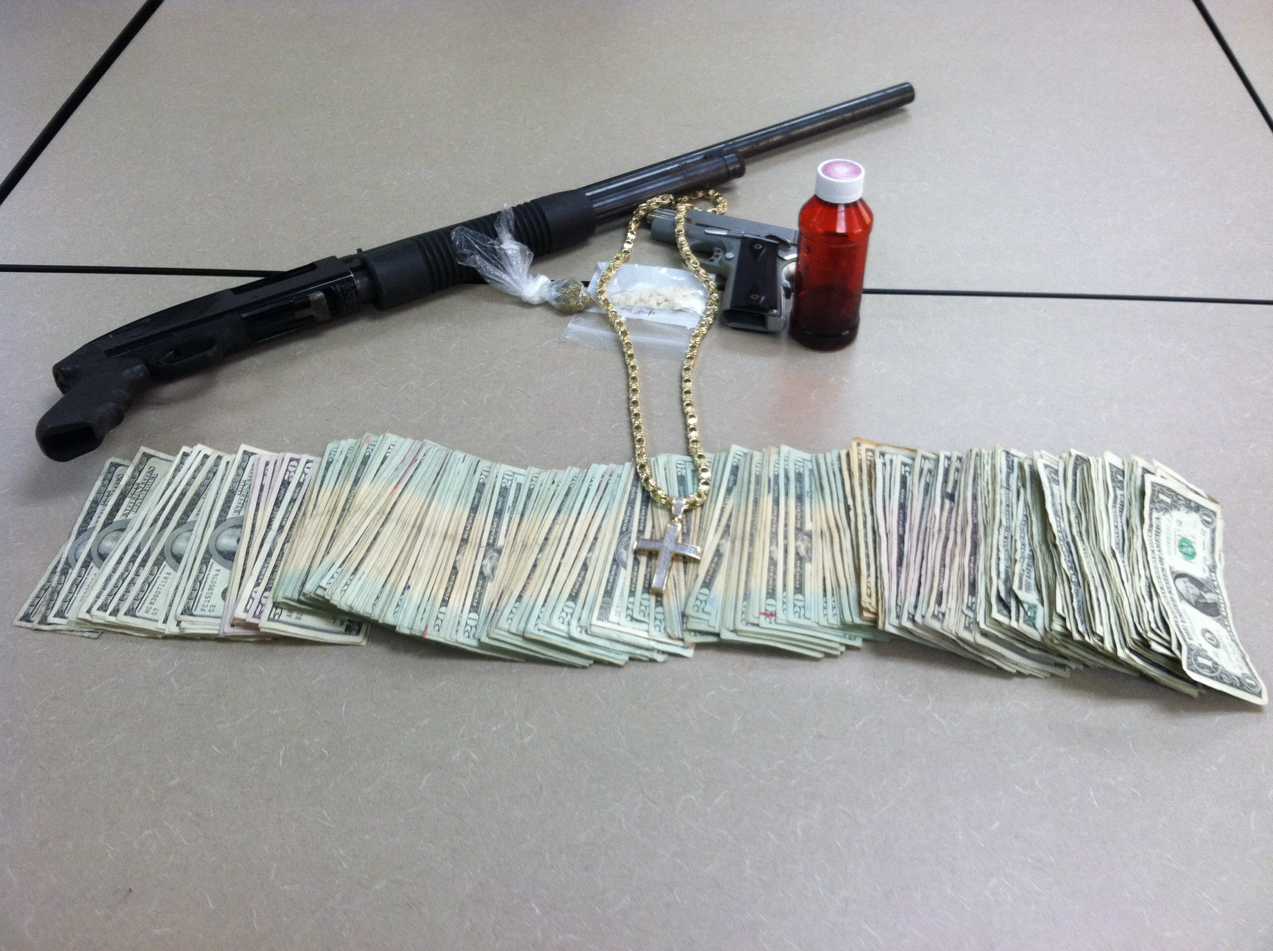Officers seized 6.3 grams of crack cocaine, 1.58 grams of marijuana, 70.24 grams of Promethazine, 1 – Mossberg 12 gauge shotgun, 1 – Springfield 9mm pistol, a gold necklace and $8,032 in cash.