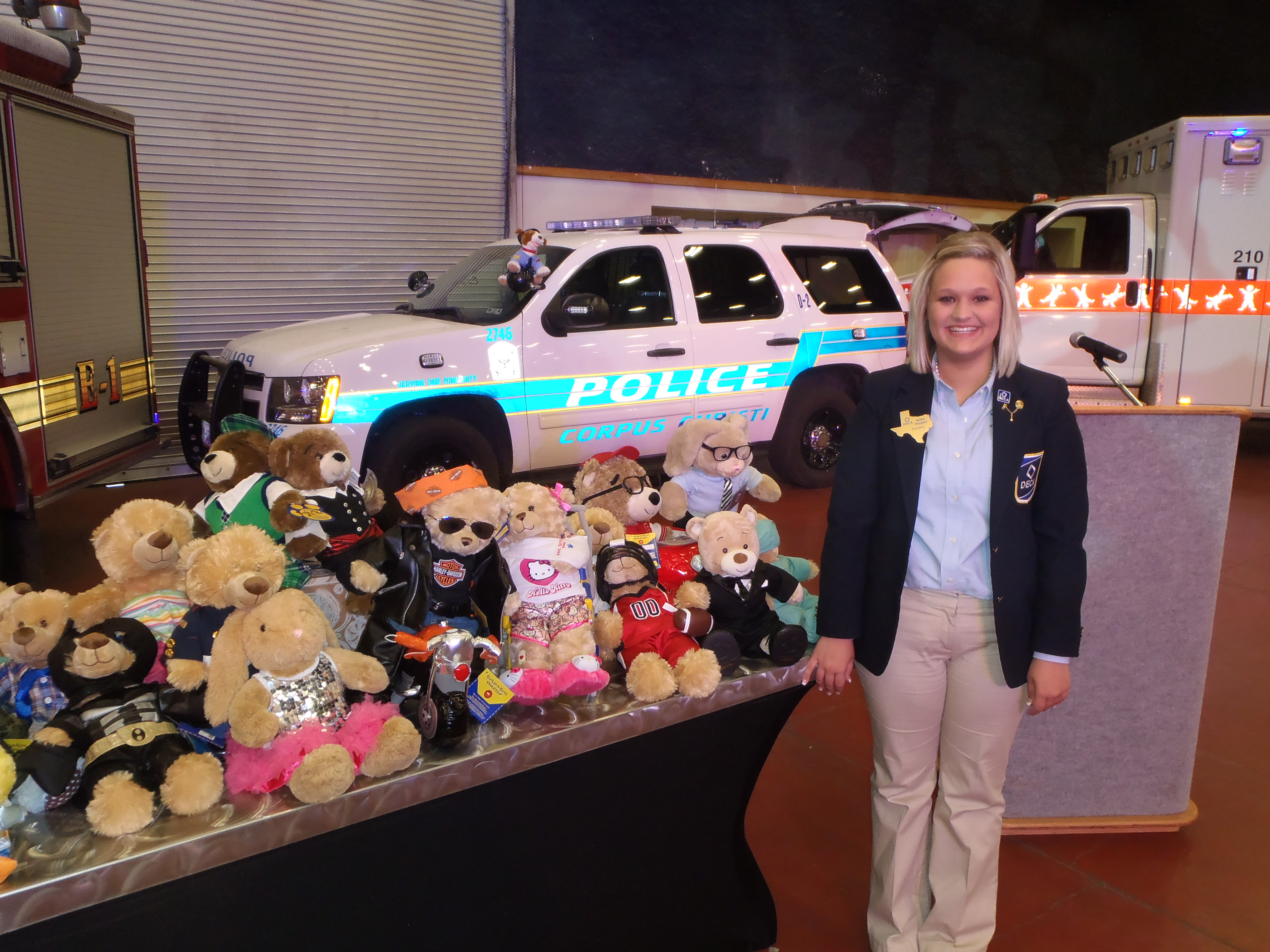 Texas DECA President Kate Hogan stands with donated bears at the American Bank Center.